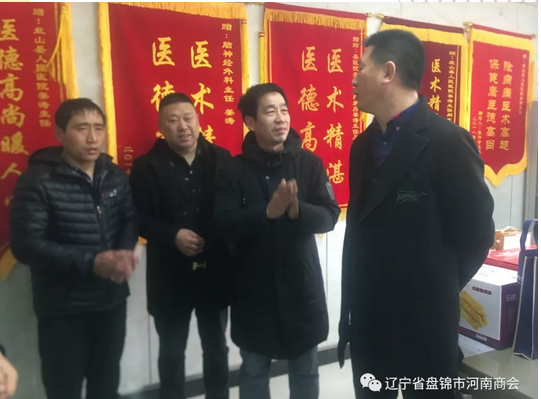 2月28日,盘锦市河南商会会长王德华、书记孙建明、监事长杨文光、秘书长潘国刚、工会主席杨勇、宣传部长杨晓亮、副会长束保国、副秘书长李薇等一行人来到盘锦市骨科医院、盘山县中心医院,看望河南老乡进行慰问。